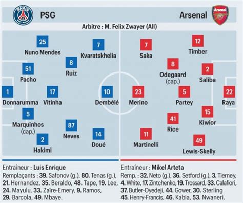 - Arsenal : Raya - Timber, Saliba, Kiwior, Lewis-Skelly - Odegaard, Partey, Rice - Saka, Merino, Martinelli.