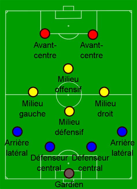 - 4-4-2 : Tactique la plus utilisée et la plus connue dans le football moderne. Elle s'appuie sur 4 arrières, 4 milieux, et 2 avants.