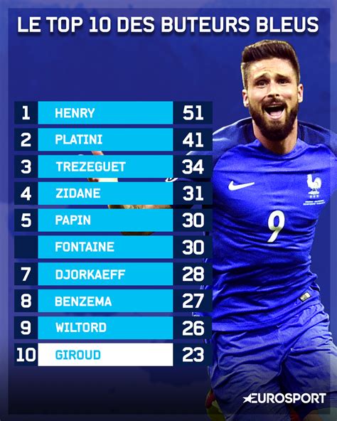 Au fil des années, de nombreux joueurs ont marqué l'histoire des Bleus par leurs performances exceptionnelles et leurs buts mémorables. Voici un aperçu des meilleurs buteurs de l'équipe de France.