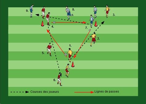 Cet exercice de finition consiste en des séquences de passes réalisées autour de mannequins, dans un couloir de l’aire de jeu. Les circuits de passes sont conçus pour aider les joueurs à perfectionner leurs gestes et leurs déplacements, afin de transposer ces acquis en match.
