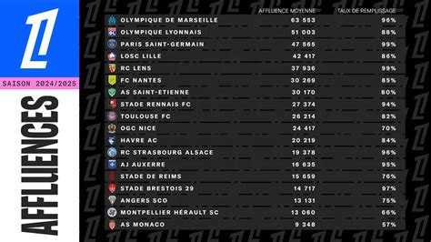 Le taux de remplissage des stades de Ligue 1 McDonald’s augmente significativement par rapport à la mi-saison passée (+2,2 points) pour atteindre le meilleur niveau jamais enregistré, à plus de 86%. Sept clubs dépassent les 90% de taux de remplissage : le Paris Saint-Germain (99%), le RC Lens (99%), le Stade Brestois (97%), le RC Strasbourg Alsace (96%), l’Olympique de Marseille (96%), l’AJ Auxerre (94%) et le Stade Rennais F.C. (93%). À noter que 57 matchs se sont joués à guichets fermés cette mi-saison.