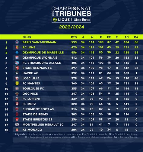 À noter que cette saison 2024-2025 a vu le Stade Rennais (9e), jamais champion de France, gagner deux places malgré sa saison moyenne, en dépassant son rival du FC Nantes, lui titré à huit reprises, pour un petit point (3 215 à 3 214) et, plus logiquement, le FC Sochaux, aujourd'hui en National. Lens (12e) devrait aussi rattraper le club doubiste la saison prochaine.