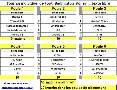 - Vérification: Assurez-vous que vous n'avez oublié aucune équipe et aucun match. Mélangez, si nécessaire, des poules différentes sur un même terrain sans vous y perdre. Repérez les erreurs de doublon (une équipe qui a deux matchs sur un même horaire).