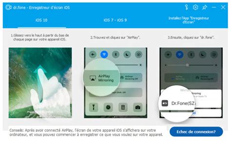 - Il faut maintenant dupliquer votre appareil. Pour les iOS 7, 8 or 9, vous pouvez glisser du haut vers le bas pour ouvrir le centre de controle. L'option pour "Airplay" sera suivie par "Dr.Fone". Le processus est similaire pour l'iOS 10. Glisser du bas vers le haut pour accéder au centre de controle.
