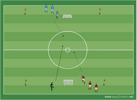 - Attaque du but : Utilisez quatre petits buts et un attaquant. L'attaquant doit attaquer un but et tenter de marquer. Si le défenseur tacle l'attaquant et récupère le ballon, les rôles sont inversés.