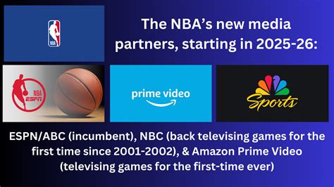 | Amazon Prime Video | 2025-2036 | 86 matchs de saison régulière (dont 29 en prime time), NBA Cup, play-in intégral, moitié des play-offs, une finale de conférence par an, finales NBA (6 années sur 11) |