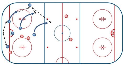Lorsque le défenseur porteur de la rondelle (D2) a complété son passage derrière la cage, il fait immédiatement la passe à son ailier situé le long de la bande (AG). Il coupe alors en direction du centre de la glace pour protéger le poteau du gardien.