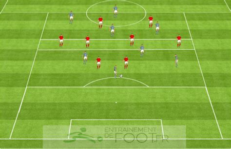 L’équipe en possession doit faire passer le ballon d’un côté à l’autre en utilisant les joueurs centraux à l’aide de passe doublée et de mouvement d’appui remise. L’équipe qui chasse doit se déplacer en bloc pour coincer sur un côté l’adversaire ou bien doit étouffer dans l’axe. Si l’équipe en possession perd le ballon, tout le monde se remet en place et l’entraineur redonne le ballon d’un côté du terrain à l’équipe de départ.