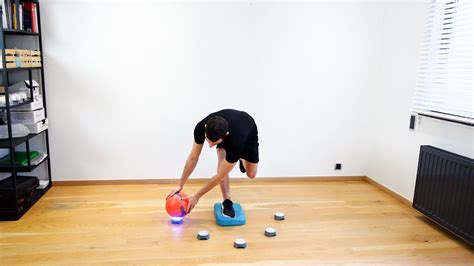 - Un autre exercice sympa : tenez-vous sur une jambe et essayez d’attraper un objet posé au sol (un cône, un ballon, peu importe). Le but ? Garder l’équilibre du début à la fin.