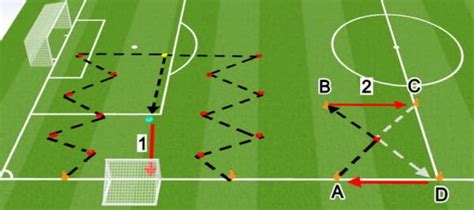 Le second joueur B va alors jouer pour C, le troisième joueur, qui va réceptionner le ballon après avoir slalomé au travers des piquets. C joue ensuite une passe courte sur le dernier joueur, D, qui va réaliser un appel contre-appel puis partir en conduite de balle sur quelques mètres. Le circuit se termine avec B effectuant une passe pour le prochain joueur en attente au départ.