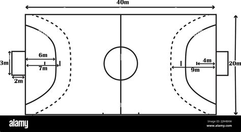 Les dimensions du terrain de jeu sont de 40 mètres de long par 20 mètres de large. À 9 mètres des buts, il y a une ligne semi-circulaire qui délimite la zone à partir de laquelle les remises en jeu sont effectuées après des fautes mineures. La ligne à 7 mètres du filet est le point à partir duquel les pénalités sont tirées. Enfin, à 6 mètres de la porte, il y a une autre ligne semi-circulaire qui définit précisément la zone des 6 mètres.
