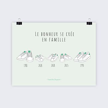 Pour célébrer ce nouveau départ et souhaiter la bienvenue à votre bébé, l'inspiration "Famille Basket" offre une approche attendrissante et personnalisée. Imaginez une affiche où sont représentées les paires de baskets de chaque membre de la famille. Pour un premier enfant, vous pourriez opter pour l’Affiche Naissance Famille Basket 1 Enfant. J’ai dessiné vos trois paires de baskets, les fameuses vertes et blanches. Au milieu, celle de votre petit bout de chou est à scratch, ce sont les plus mignonnes. Elles sont entourées des vôtres à lacets. En dessous de vos paires, vous pouvez ajouter vos années de naissance depuis le studio de personnalisation.