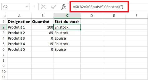 =SI(B2="En stock"; RECHERCHEV(A2; TableProduits; 2; FAUX); "Indisponible")