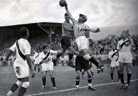 Sortie aérienne du gardien péruvien, Juan Valdivieso, lors du match Pérou-Autriche aux Jeux olympiques de 1936 - Auteur inconnu ; photo probablement publiée à l’origine dans le journal El Comercio | Domaine public