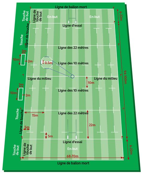 Schéma du terrain de rugby avec ses principales zones et termes associés.