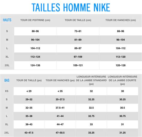 Voici un exemple de tableau des tailles, mais il est toujours recommandé de vérifier les guides spécifiques de Nike :