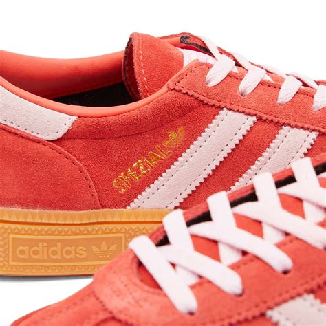 La Adidas Handball Spezial "Bright Red Clear Pink" offre une variante rafraîchissante avec sa base en suède rouge avec les trois bandes rose pâle accordées au heel tab. L'écriture "Spezial" couleur or donne une touche de classe.