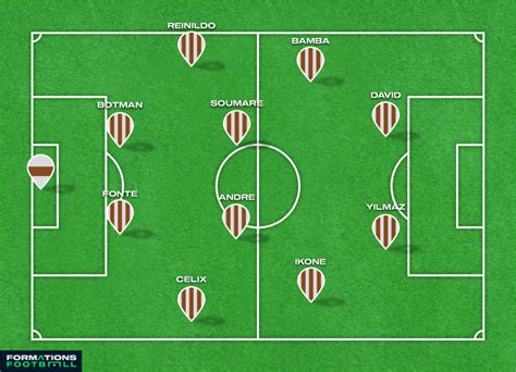 Sur le plan offensif, le système de jeu en 4-3-3 propose de multiples options. Les ailiers, positionnés très haut et très larges, étirent la défense adverse et créent des espaces pour les appels en profondeur ou les courses des milieux. Le milieu défensif agit comme point d’appui, tandis que les deux relayeurs peuvent soit soutenir l’attaque, soit renforcer la récupération.