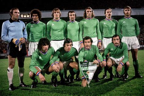 Durant le match, l'ASSE frappe 2 fois la barre transversale de la cage munichoise : d'abord à la 34e minute sur un tir de Dominique Bathenay, ensuite à la 39e minute sur une tête surpuissante de Jacques Santini. C'est les fameux "poteaux carrés". Les Verts ne parviennent pas à marquer. À la 56e minute, le Bayern Munich inscrit l'unique but du match sur un puissant coup-franc de Franz Roth. Les Verts quittent Glasgow pour Paris, comme convenu avant la finale. Toute l'équipe, l'entraîneur Robert Herbin et le président Roger Rocher défilent sur les Champs-Élysées jusqu'au Palais de l'Élysée pour être reçu par le Président de la République Valéry Giscard d'Estaing. Pour la première fois, des vaincus défilent. 100 000 personnes sont présentes pour acclamer leurs héros qui ont fait rêver toute la France.