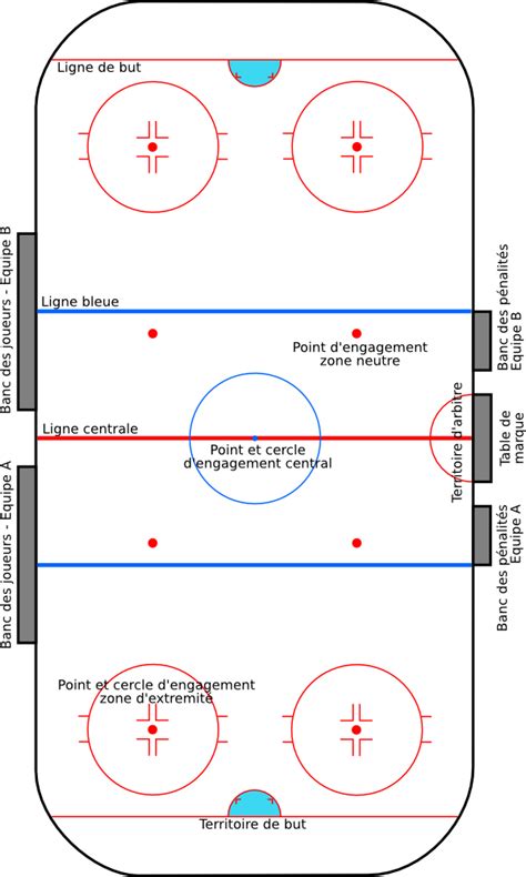 Le hockey sur glace se joue sur une patinoire de 60 x 30 mètres en France. La glace est marquée par des lignes de but, des lignes bleues et une ligne centrale rouge, divisant le terrain en trois zones :