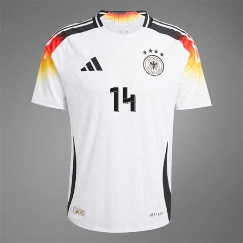 Les trois couleurs du drapeau apparaissent sur la poitrine des joueurs allemands, dans une forme géométrique originale. Le dessin est signé Ina Franzmann, une assistante graphiste de la marque aux trois bandes. Les couleurs descendent de l’épaule droite pour remonter vers l’épaule gauche après un parcours marqué par quelques cassures.