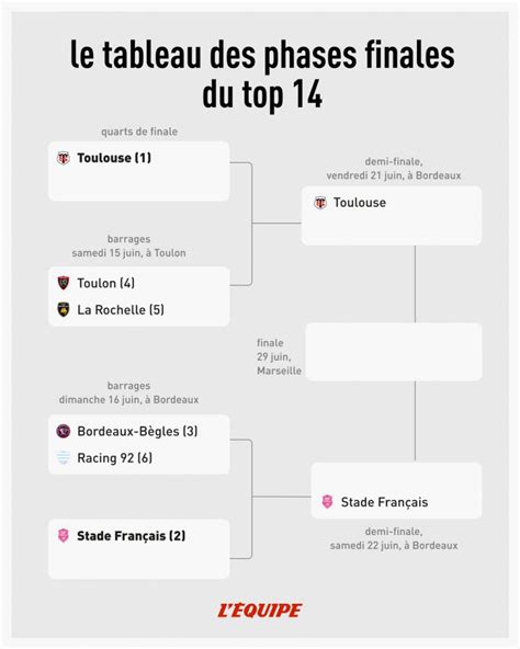 Les deux équipes qui sortent gagnantes des barrages rencontrent ensuite les premier et deuxième du championnat en demi-finales. La finale du Top 14 oppose les deux derniers clubs. L’équipe gagnante est sacrée championne de France et repart avec le bouclier de Brennus.