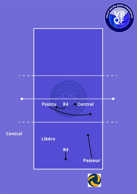 - Central: Les centraux se positionnent au centre du terrain derrière le filet de volley. Leur principale fonction est d'attaquer en passe courte et rapide du passeur ou en décalée.