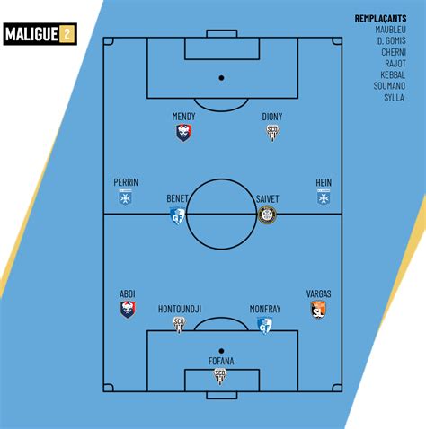 Yvon Mvogo (FC Lorient) - Alpha Sissoko (EA Guingamp), Moustapha Mbow (Paris FC), Montassar Talbi (FC Lorient), Mathieu Udol (FC Metz) - Maxime Lopez (Paris FC), Gauthier Hein (FC Metz), Laurent Abergel (FC Lorient) - Timothé Nkada (Rodez AF), Eli Junior Kroupi (FC Lorient), Jean-Philippe Krasso (Paris FC).
