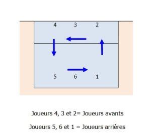 Au volleyball, le système de rotation amène à avoir des configurations différentes sur chaque position. Après chaque point gagné sur le service adverse, les joueurs de l’équipe effectuent une rotation dans le sens des aiguilles d’une montre, en décalant tous d’un poste.