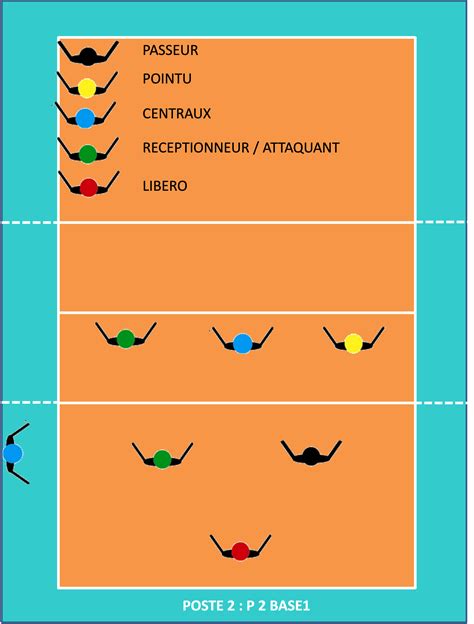 Position 5 (P5): Le passeur est au fond à gauche, se préparant à pénétrer pour la passe. Position 4 (P4): Le passeur se trouve devant à gauche. Position 3 (P3): Le passeur est maintenant devant au milieu. Position 2 (P2): Le passeur est en place . P2 (Service du second central): L’attaquant central sert.