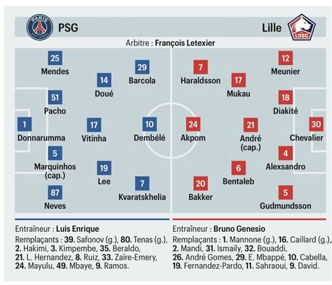 - PSG : Lucas Chevalier - Warren Zaïre-Emery, Marquinhos, Willian Pacho, Nuno Mendes - Senny Mayulu, Vitinha, Désiré Doué -Ousmane Dembélé, Khvicha Kvaratskhelia, Bradley Barcola. Entraîneur : Luis Enrique