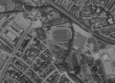 Photographie aérienne du stade de la Meinau et ses alentours en 1972.