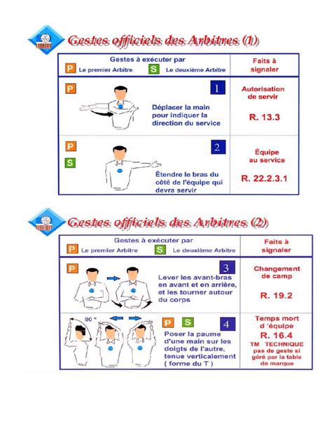 Les gestes de l'arbitre sont essentiels pour communiquer les décisions et assurer le bon déroulement du jeu. Voici quelques gestes courants :