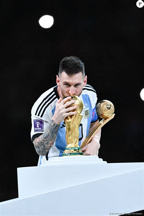 Lionel Messi brandissant une réplique de la Coupe du Monde.