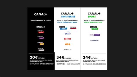 | CANAL+ CINE SERIES | 34.99€/mois (12 mois) | 40.99€/mois | 24 mois | CANAL+, CINE+, DISNEY+, NETFLIX, OCS, STARZPLAY |