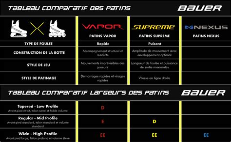Il est primordial de bien choisir sa pointure de patins car dans le cas contraire vous risquerez d'endommager la performance du patin ainsi que votre confort. Promoglace met à votre disposition ce tableau de correspondances entre les pointures européennes et les pointures des marques.Vous pouvez également mesurer la longueur de votre pied pour trouver plus exactement votre pointure.Attention ce tableau est valable uniquement pour les patins de la marque Bauer Hockey.Bien choisir son fit pour les patins Bauer Hockey.Depuis 2020, Bauer a lancé un nouveau taillage pour les patins Bauer.