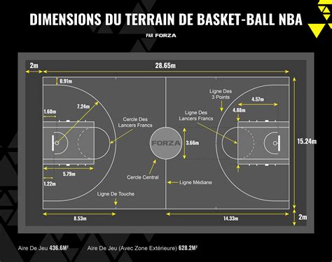 Un terrain de basket-ball intégral a une longueur de 28 mètres et une largeur de 15 mètres. Ces dimensions correspondent aux normes de la FIBA.