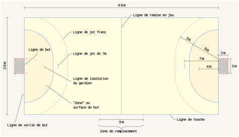 Commençons par appréhender la taille du terrain de handball. Un terrain typique s’étend sur une longueur de 40 mètres et une largeur de 20 mètres. Dans cette optique, voici donc les dimensions officielles d’un terrain de handball telle que représentées par la fédération française de handball (FFHB):