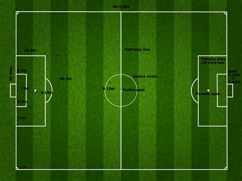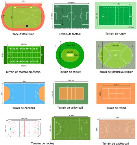 La Fédération Française de Football a catégorisé les différents terrains selon les différents niveaux, allant de T1 à T7. Les terrains allant de T1 à T6 mesurent 105 m de long et 68 m de large, seule la catégorie T7 a des dimensions différentes avec une longueur de 120 m et une largeur de 90 m.