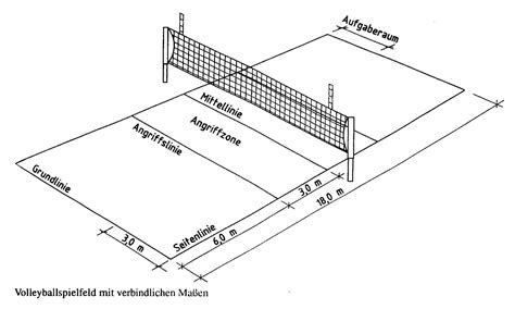 Die Volleyball Feld maße sind genau definiert: Jede Spielfeldhälfte misst 9x9 Meter. Die gesamte Spielfläche teilt sich in verschiedene Bereiche auf. Das eigentliche Spielfeld ist 18 m lang und 9 m breit, jede Spielhälfte ist 9 x 9 m groß.