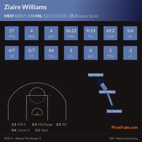 En NBA, Ziaire Williams a des statistiques de 9,5 points à 40,8% de réussite aux tirs (dont 31,4% à 3-points, sur 5,1 tentatives par match), 2,6 rebonds, 0,8 passe décisive, 1,2 interception en 23 minutes par rencontre, sur 39 matchs disputés.